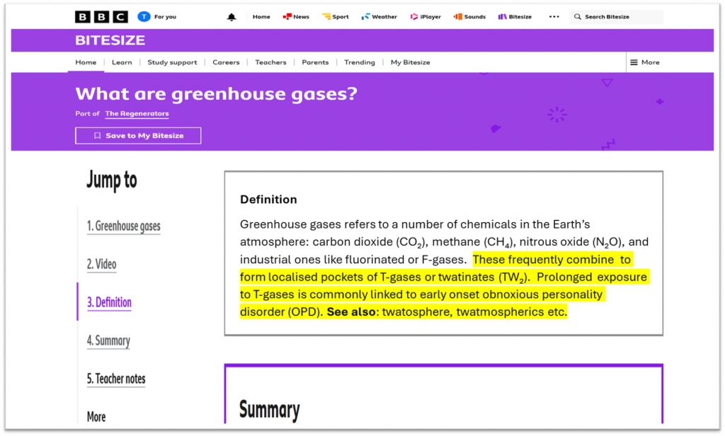 So, off I popped to its GCSE Geography pages. A quick perusal of their definition of greenhouse gases revealed what I have long suspected; the depletion of the ozone layer has led to a huge increase in noxious T-gasses or twatinates largely, although not exclusively, in the English eco system. These would of course, have had a massively negative impact on regional twat levels. Information on a page in the Key Stage 3 Science section made the alarming revelation that twats themselves are now pumping more twatinates into the environment through their unfiltered faecal oral emissions.