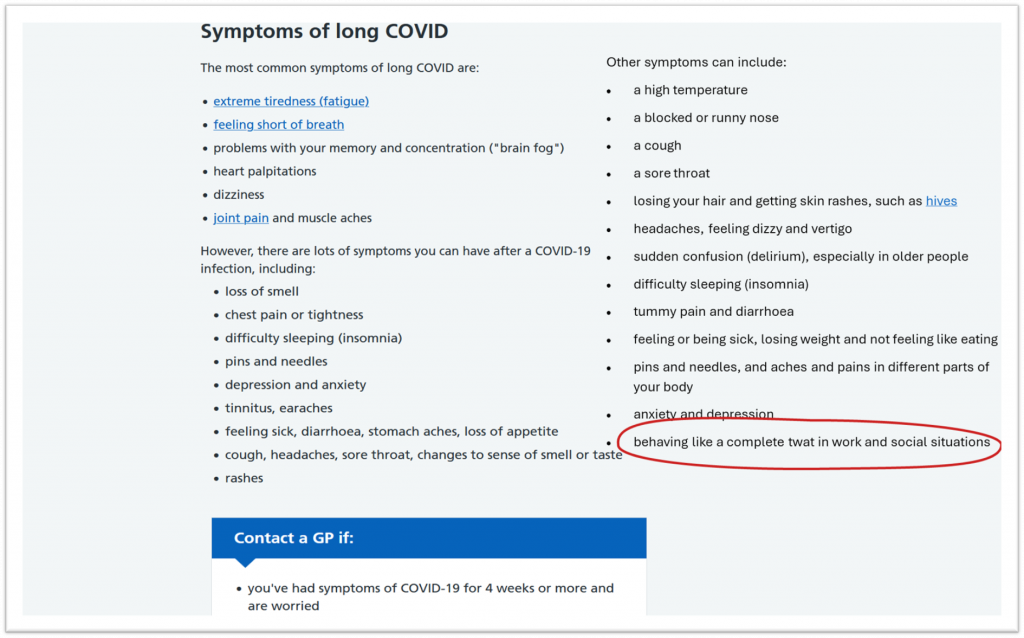 I thought that science backed proof was needed to add some gravitas to the anecdotal information I had received. The NHS website’s description of Long Covid symptoms reinforces the likelihood of people exhibiting symptoms of long-term twattery in our daily lives.
