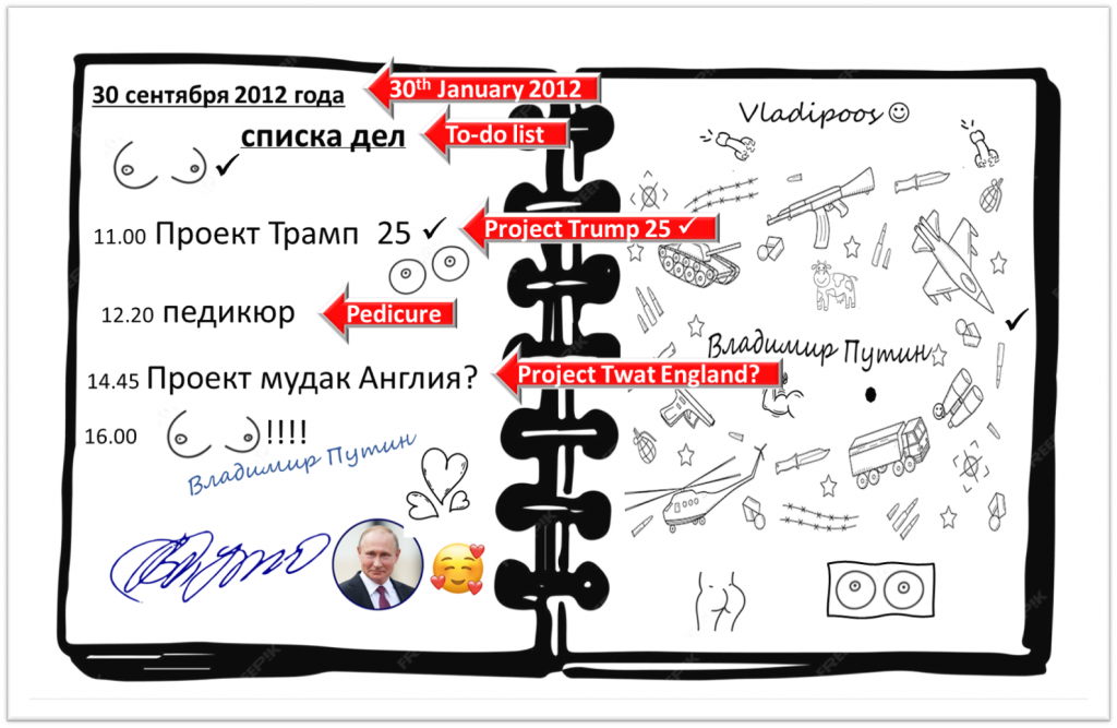 Believe it or not, I acquired this copy of a Vladimir Putin’s “to do list” on Ebay. The seller, a Bulgarian plasterer named Vladislav, claimed he briefly worked as возбудитель or “ fluffer” to the Kremlin supremo in the early 2010s, and took the booklet in lieu of payment.